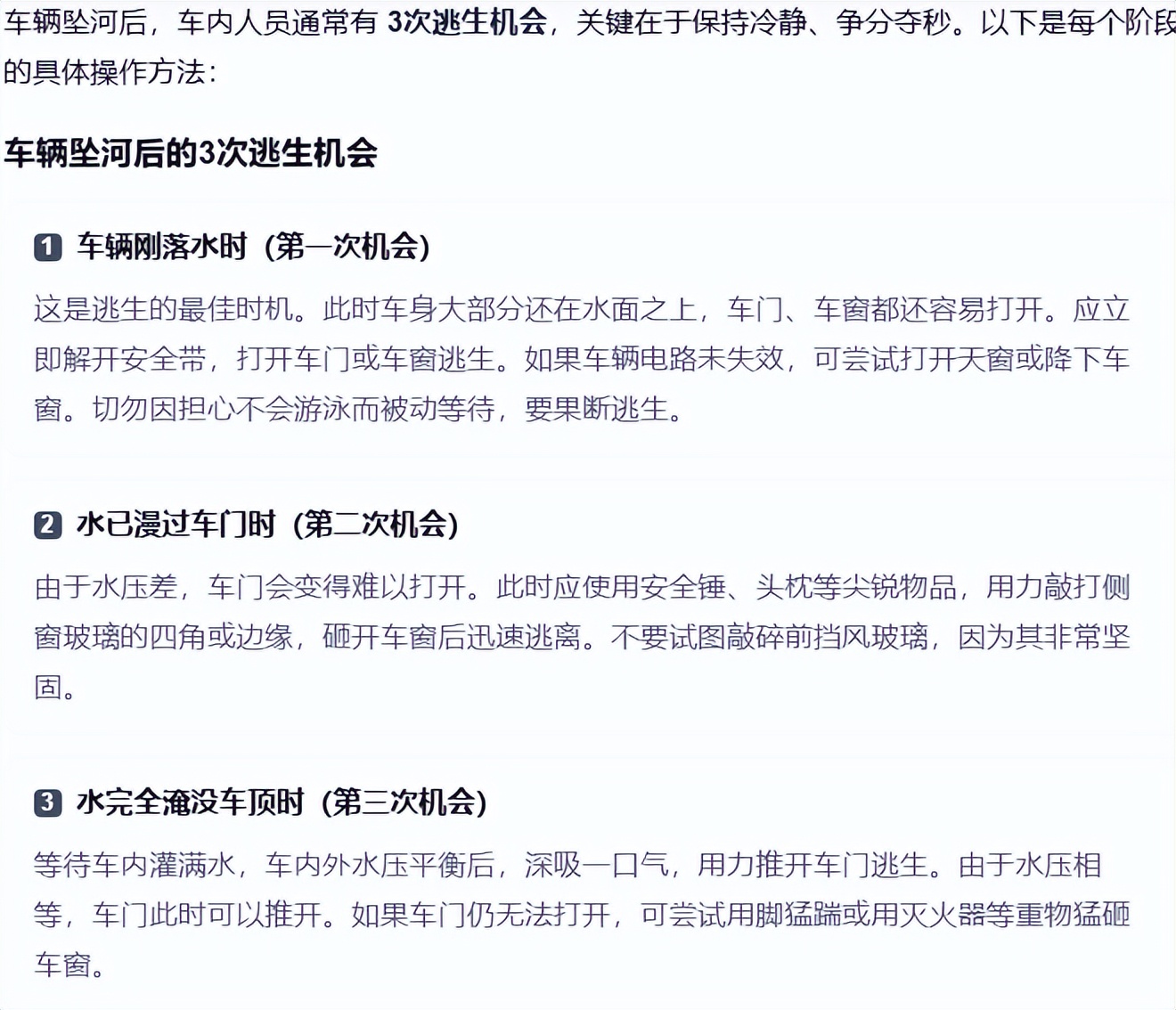 其实在车辆坠河后都有三次逃生的机会,第一是刚落水时,那时车辆还没有安全沉入河中,车窗车门还可以打开,应该立即打开车窗和车门逃生。