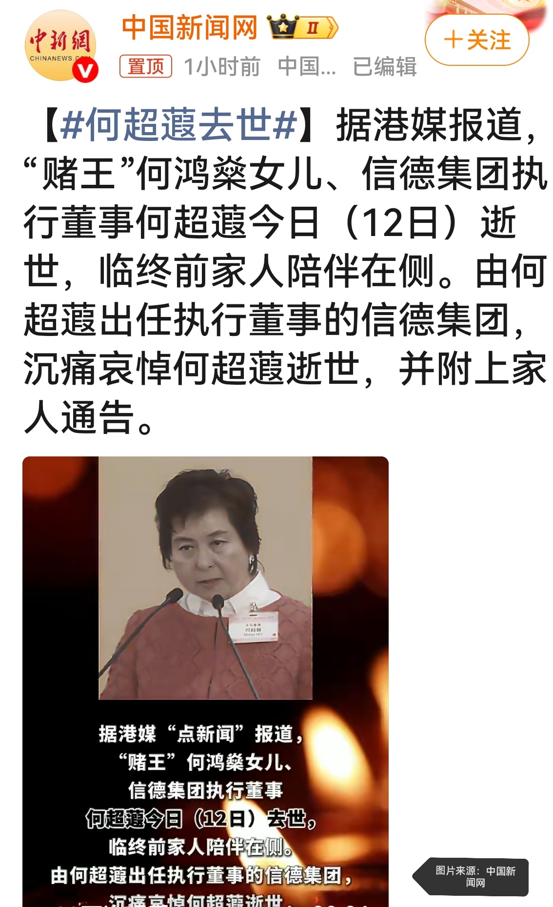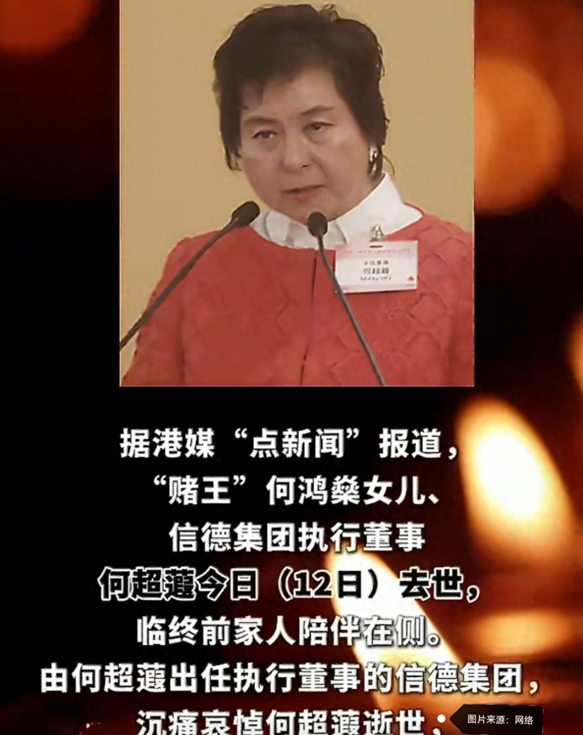 何超蕸是赌王家族中低调却重要的一员,长期在信德集团担任要职,负责家族相关业务,行事稳重,很少出现在娱乐八卦版面。这样一位出身优渥、事业稳定的豪门千金,突然离世,让不少网友感到震惊和惋惜。消息一经发布,迅速登上热搜,引发全网关注与讨论。