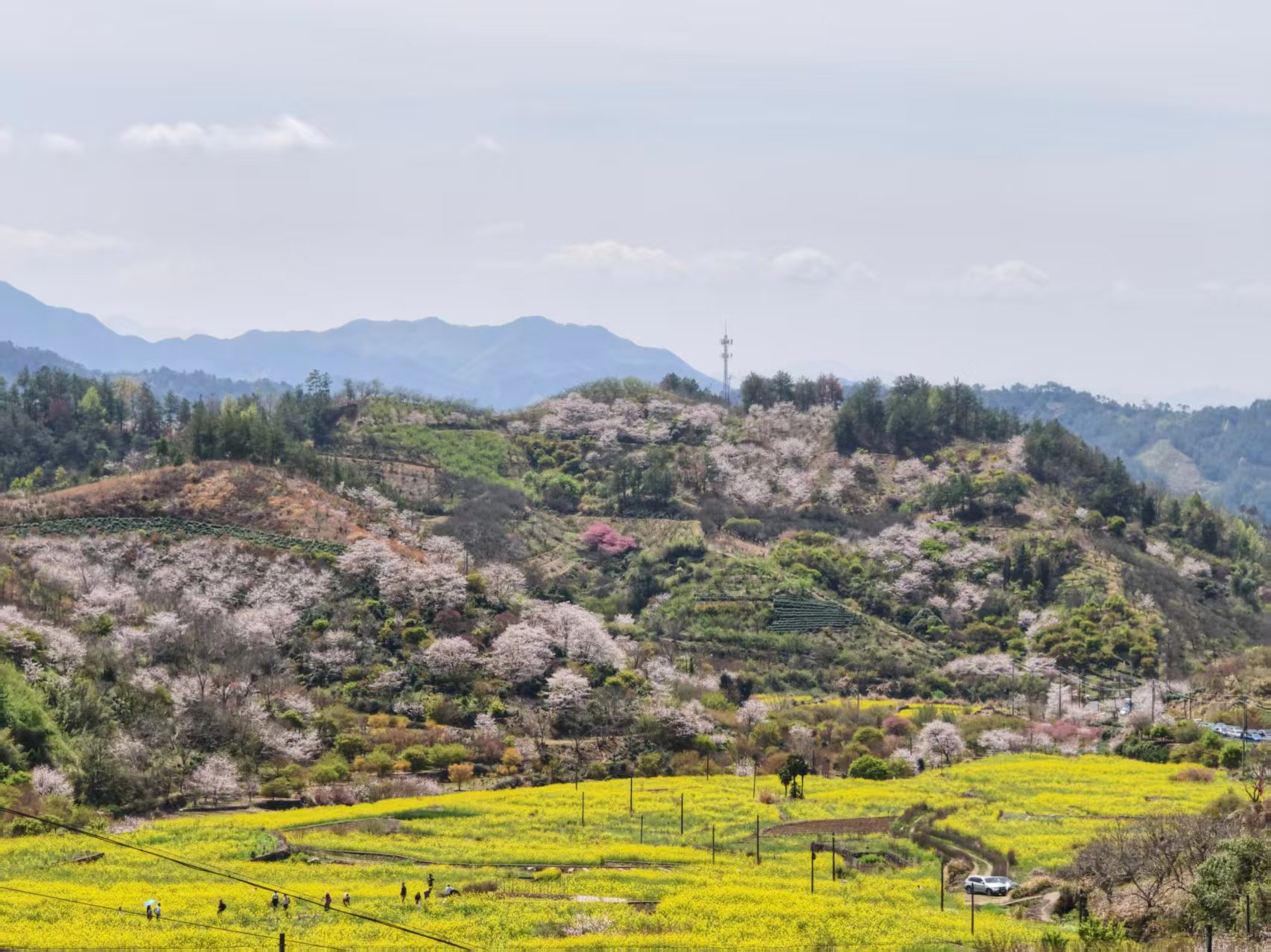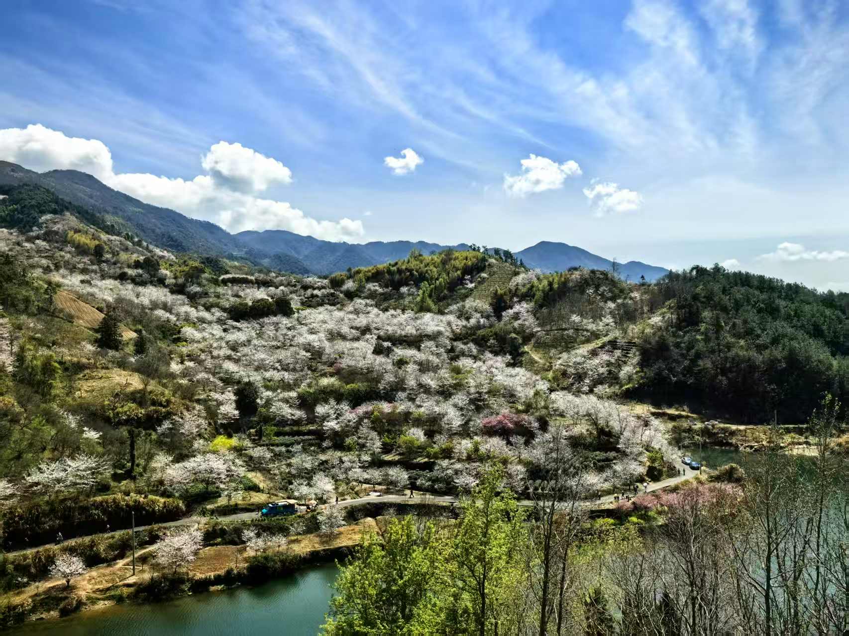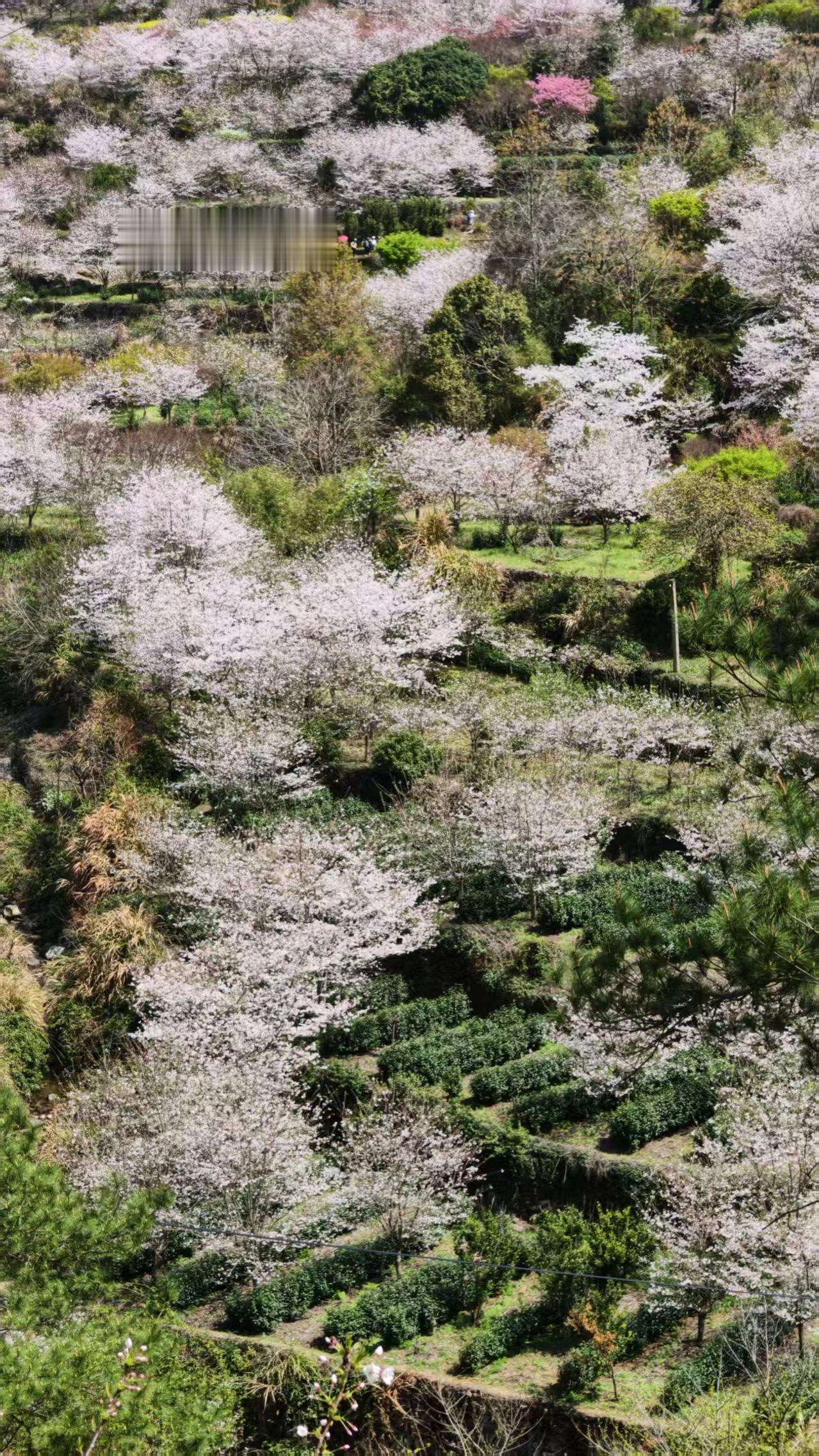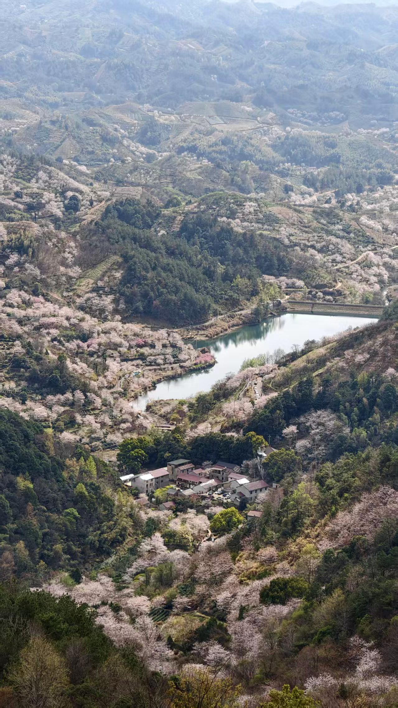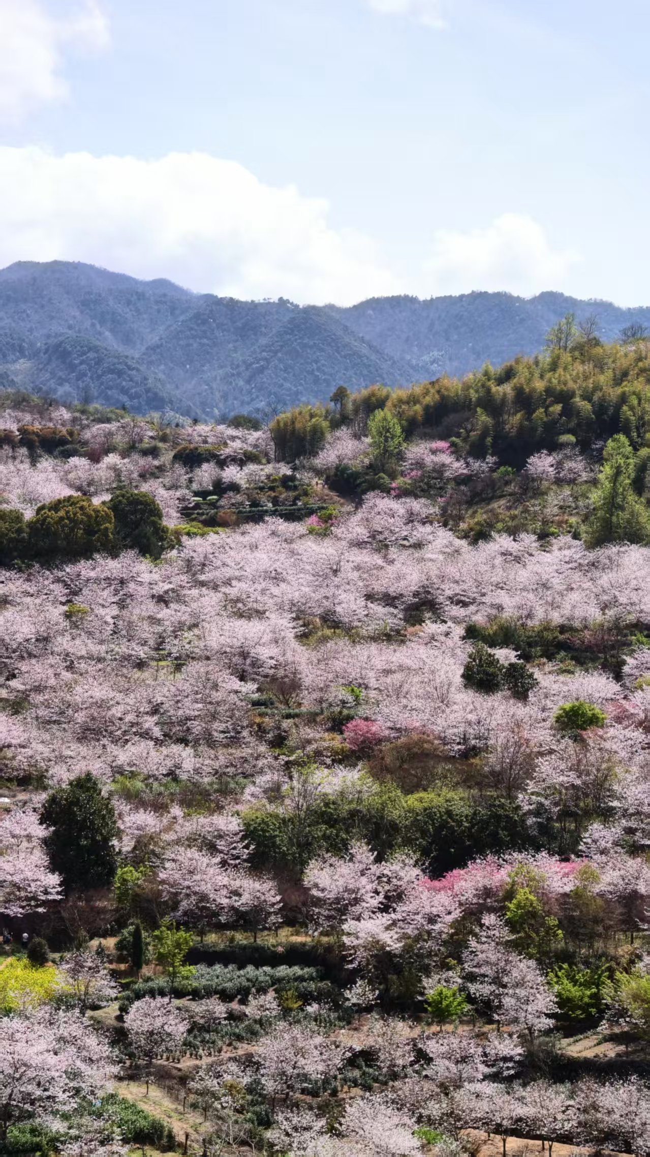 穿过清潭坑的村庄,在樱花簇拥下,行至高处俯瞰,万亩樱花谷尽收眼底,粉白花海顺着山势起伏绵延,如流云漫卷,似雪浪翻涌,将连绵青山晕染成温柔的画卷,目之所及皆是浪漫。