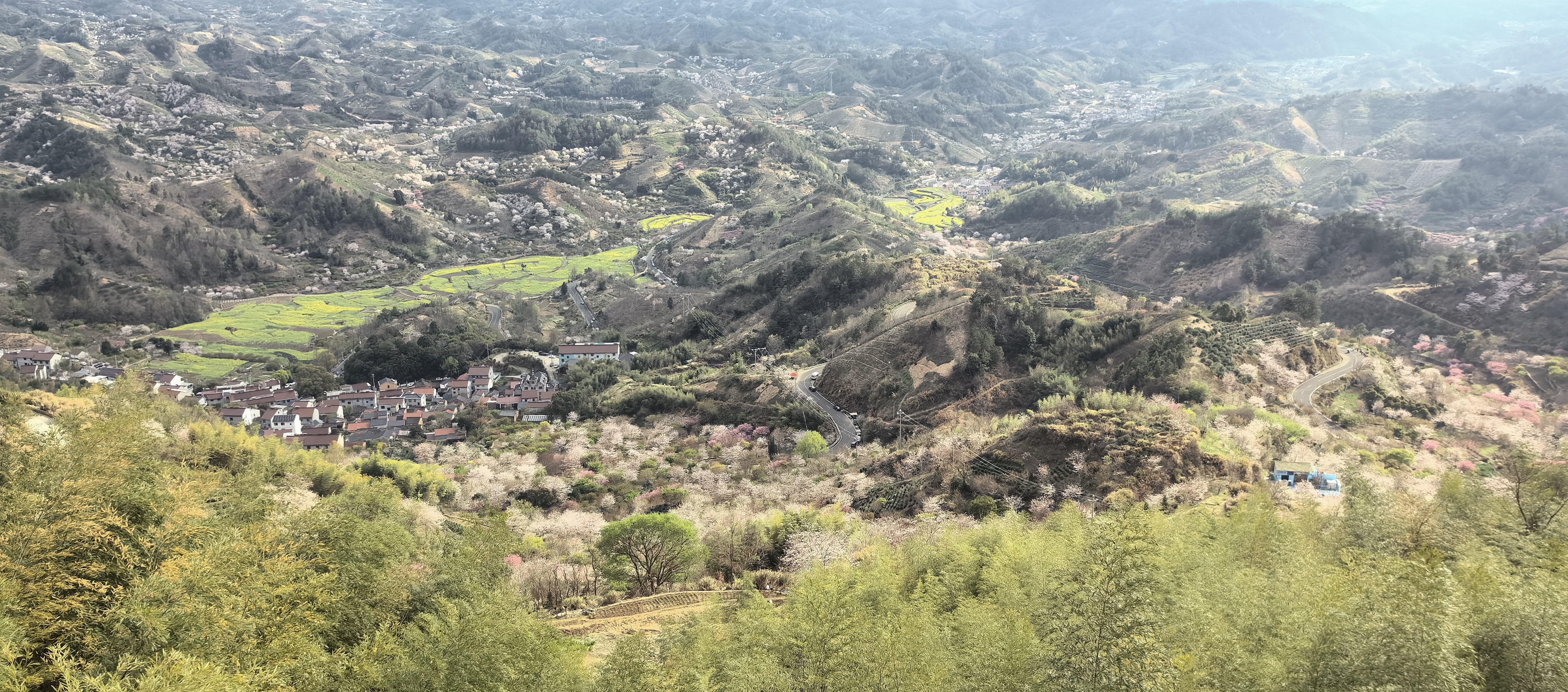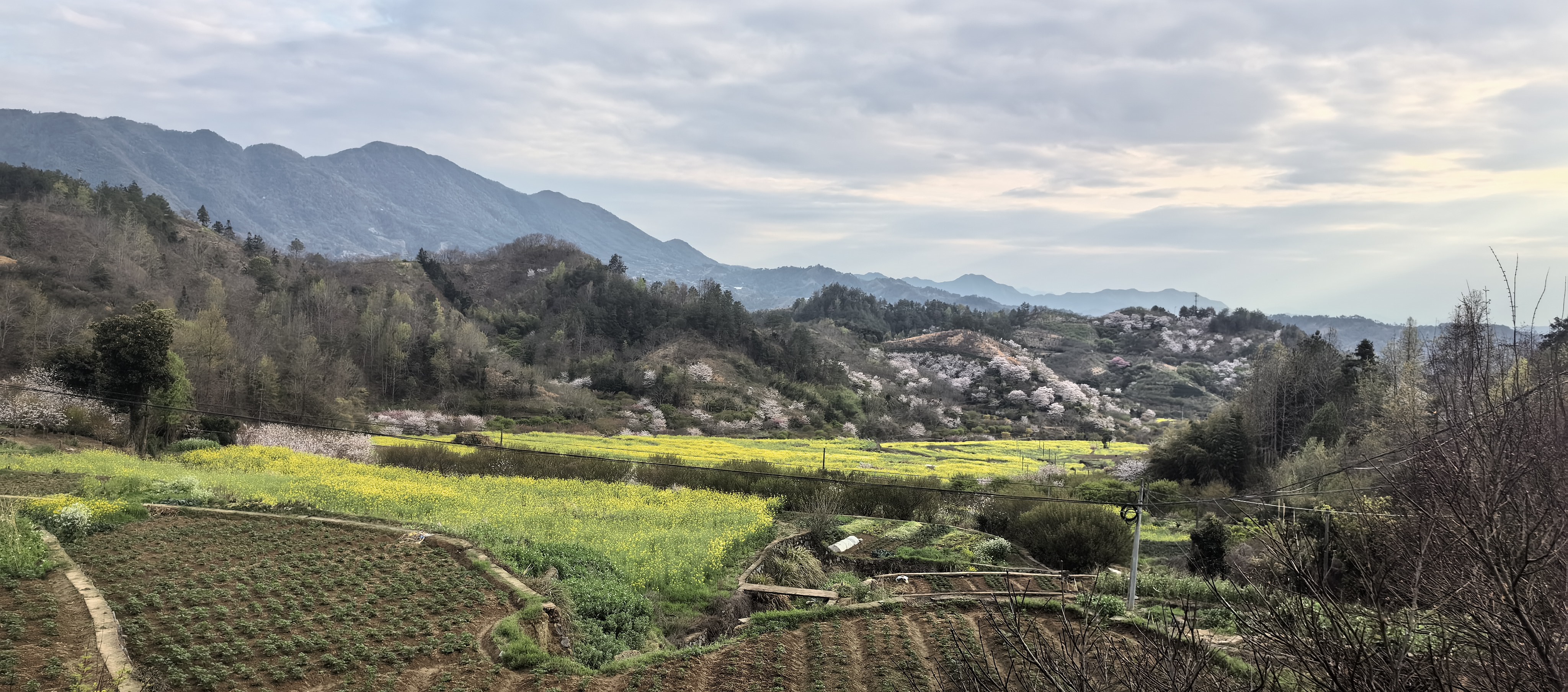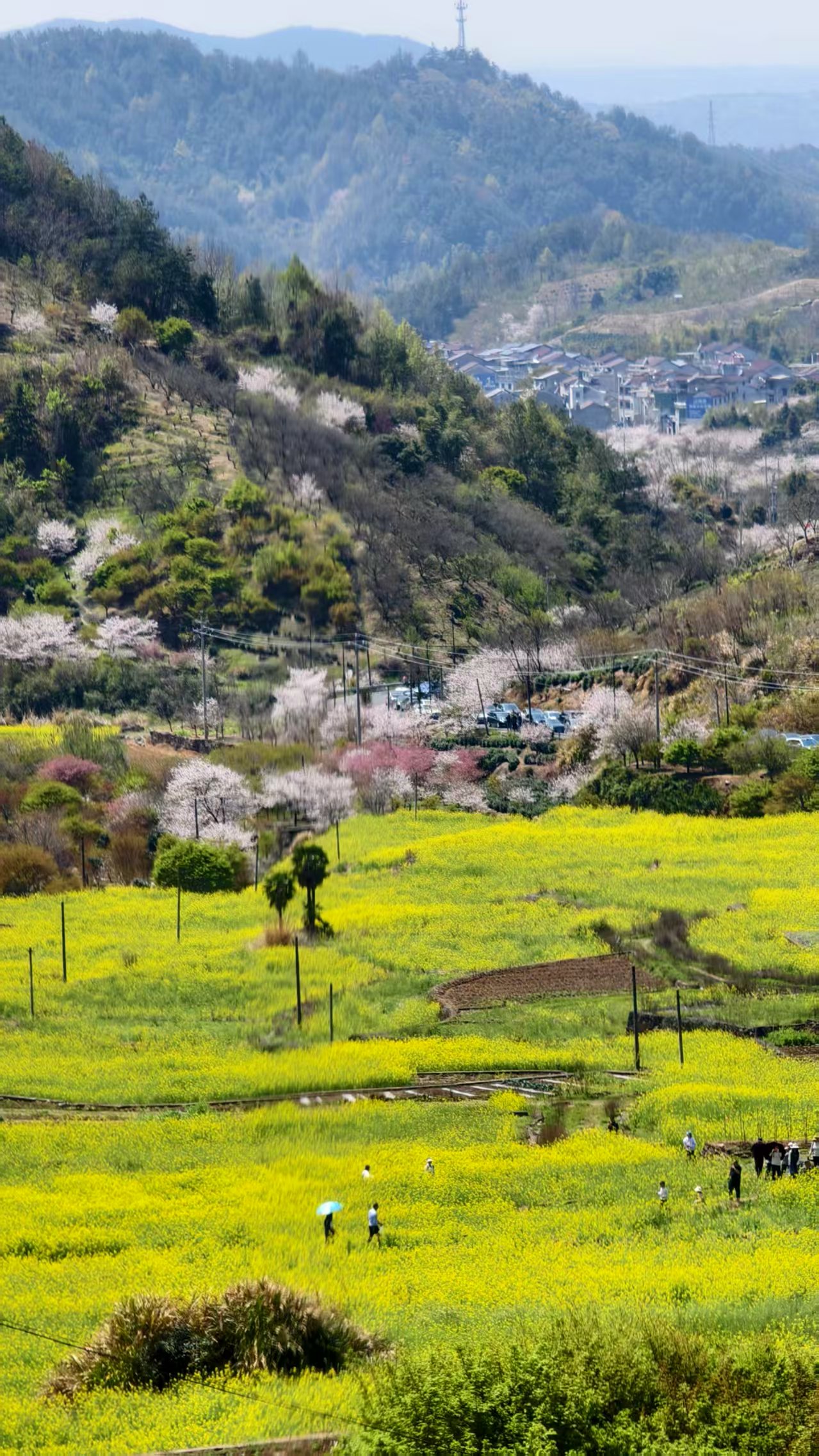 反走的意义就是上坡更累一点,但安全性更高一点。越是往上视野愈发开阔,梯田与花海交织错落。粉樱缀满田埂,青瓦古村点缀其间,炊烟袅袅,相映成趣。每挪动一步,景色就有不同的变化。反正不是一个美字就能比拟的。