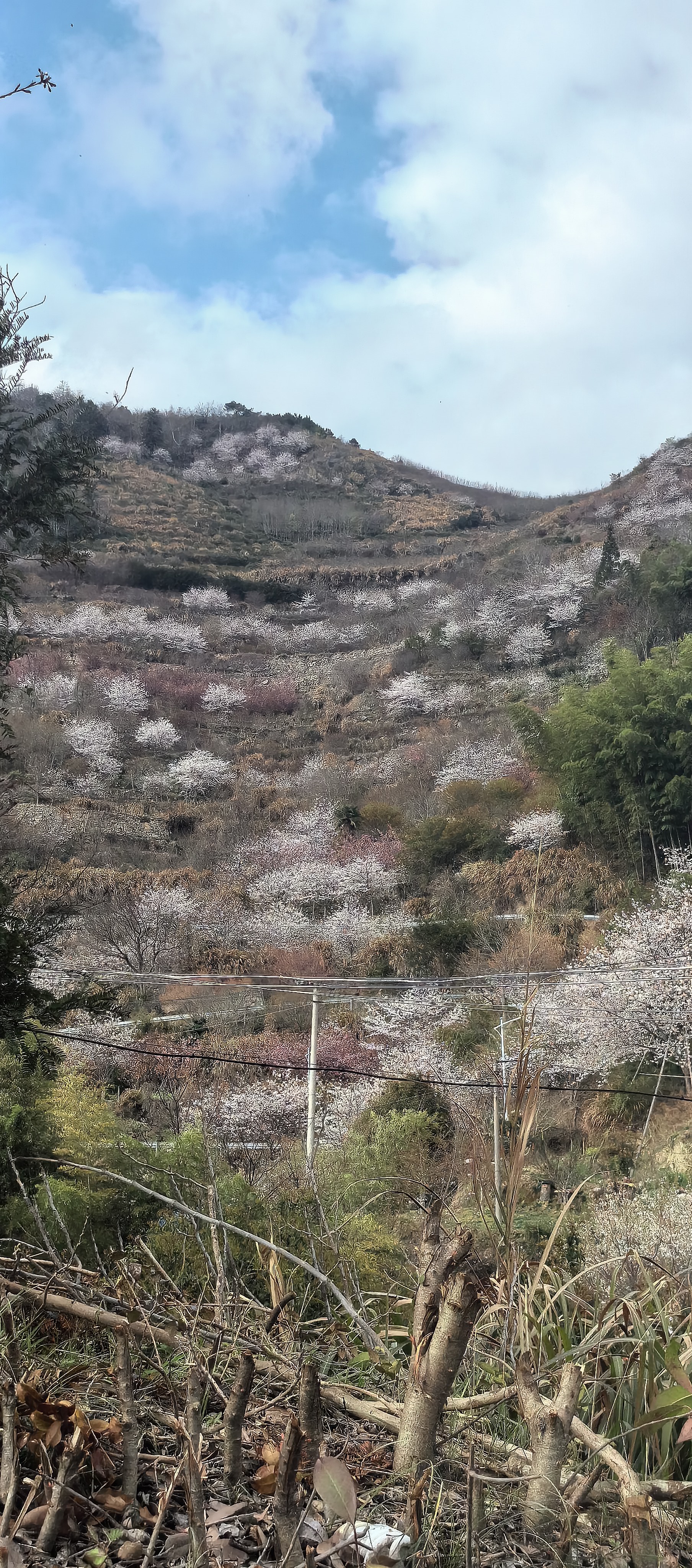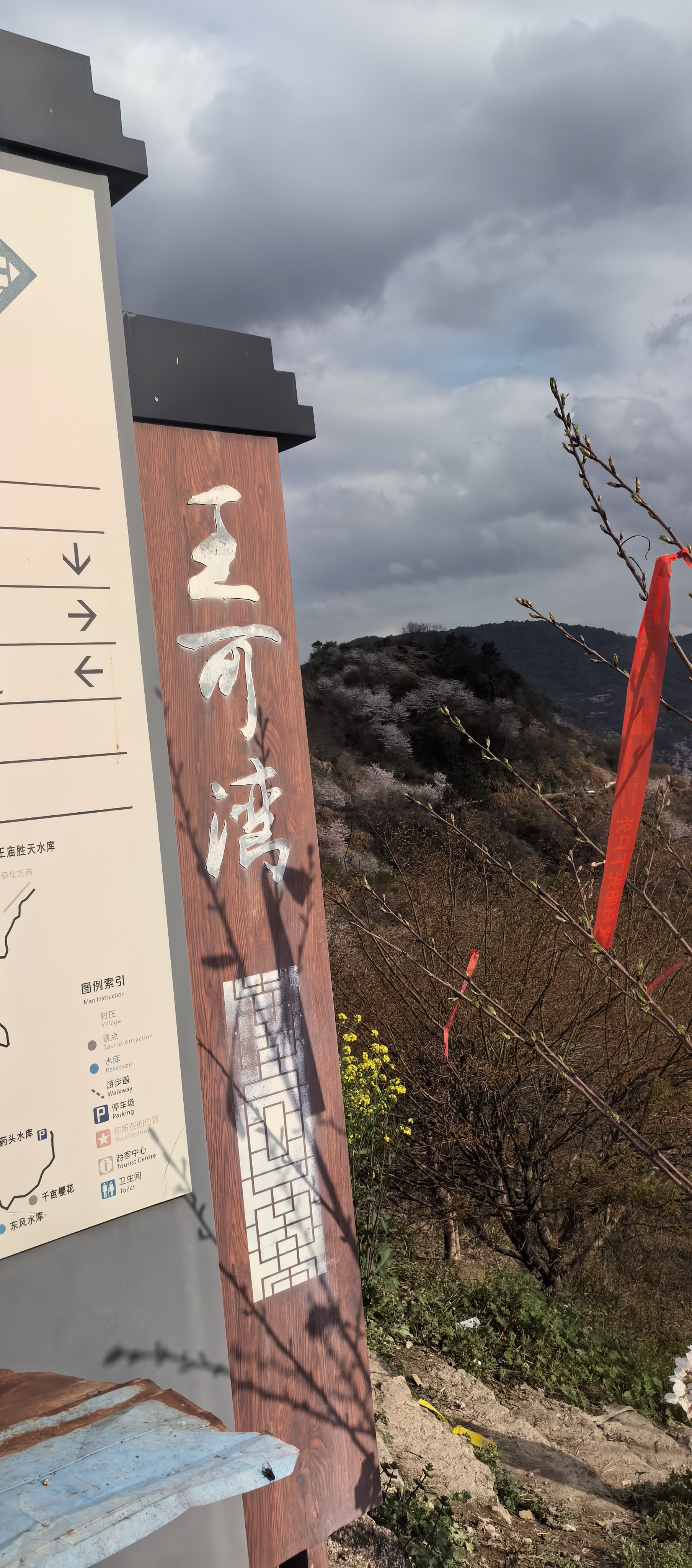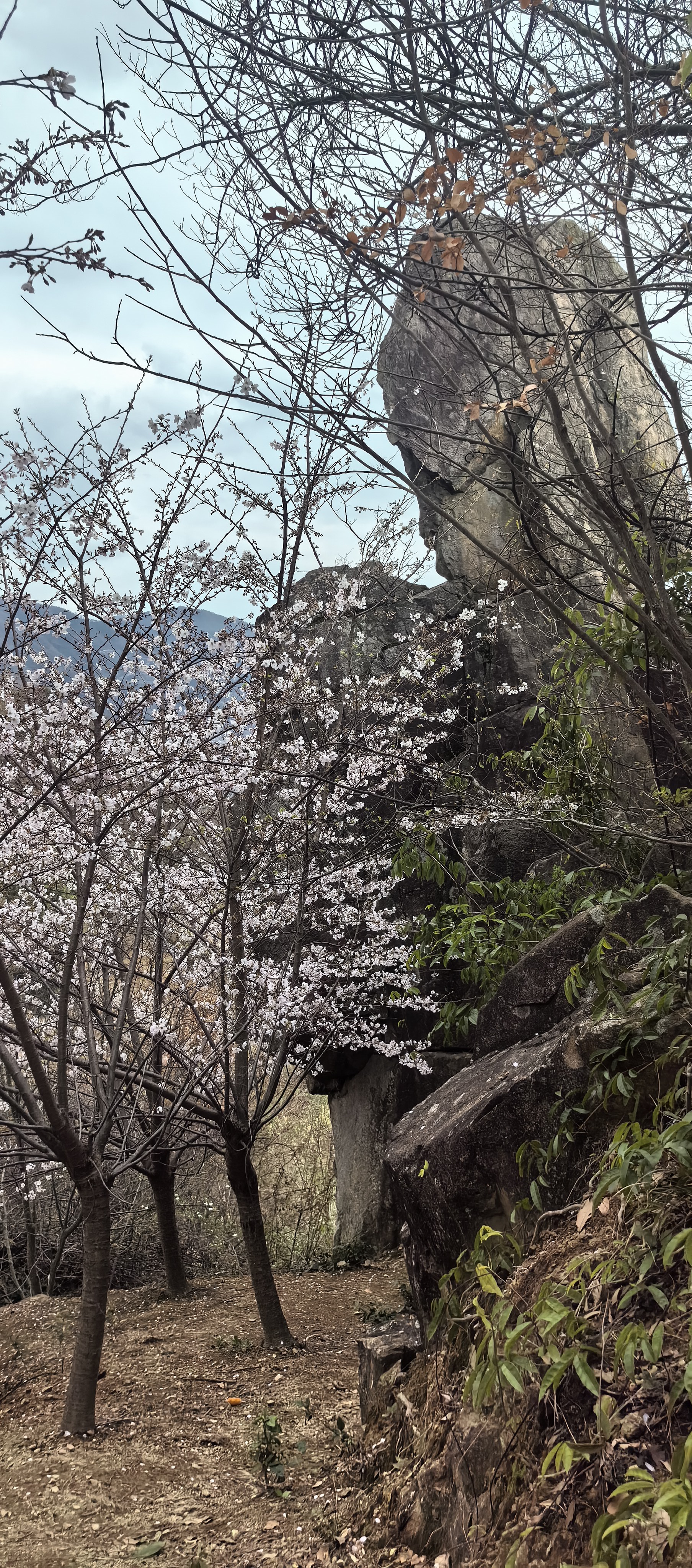 那天我从董坞岗村出发。沿着野路和古老的台阶向上,到达了王可湾东风村。站在观景台上遥望远方,再加上那天是阴天,所以到处显得很暗淡。所有樱花树上的樱花 都含苞欲放立于枝头 尚未开放。偶尔可见一两朵,像爆米花一样,挂在 挂满花骨朵的的树干上。