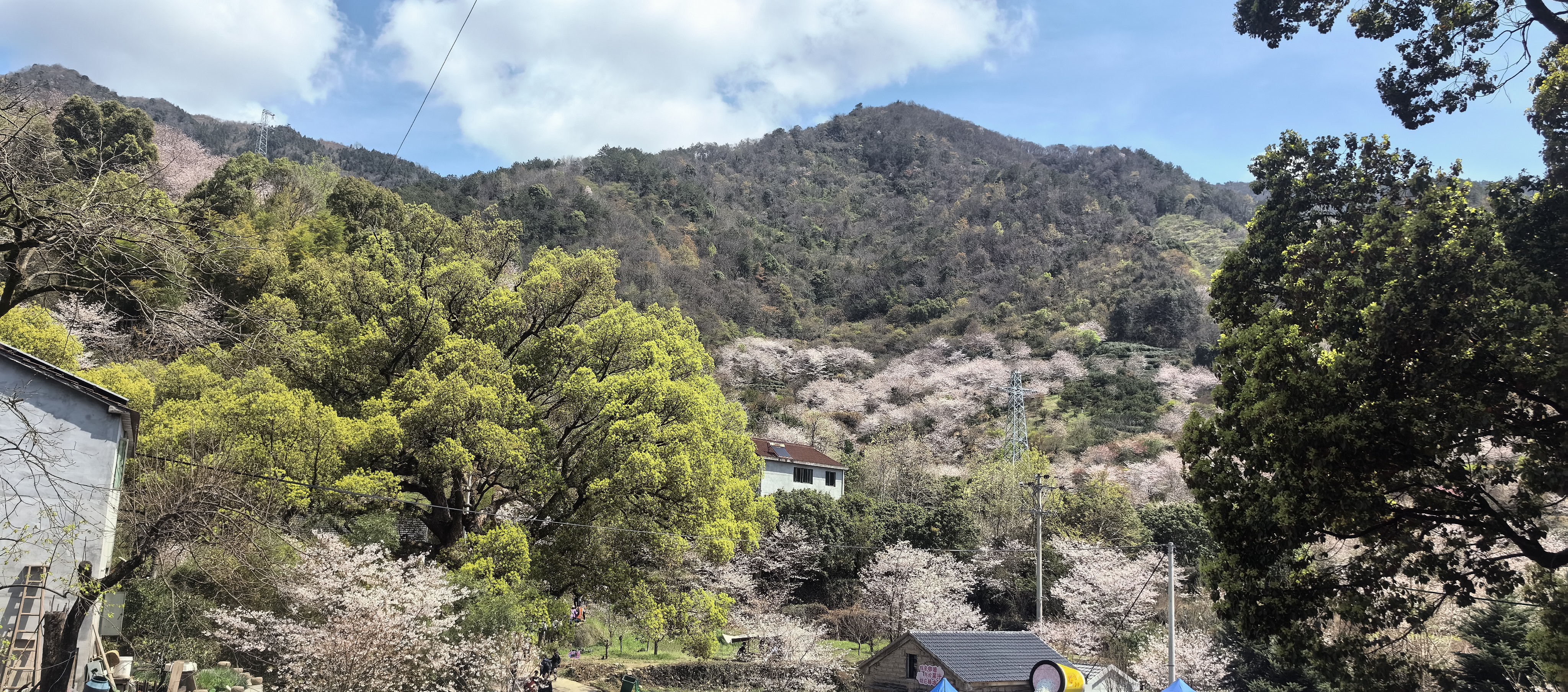 沿着花海逆行,从董坞岗村到清潭坑村,一路都被温柔的樱花簇拥。枝头的染井吉野樱开得热烈,粉白花瓣层层叠叠,风一吹便 翩翩起舞。