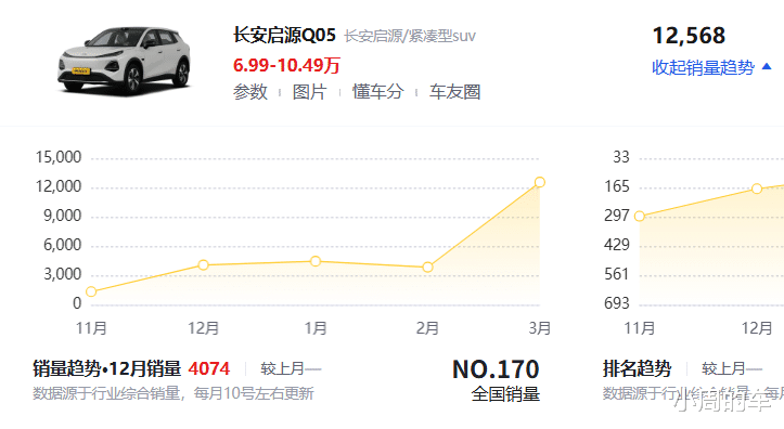 就比如刚刚结束的3月份,在紧凑型纯电SUV榜单中,深蓝S05以及长安启源Q05分列前二,而像比亚迪元PLUS、吉利银河E5、AION Y等“经典”车型月销量均未能超过一万辆。其中,长安启源Q05单月卖出了12568辆,环比大涨226%,要知道该车在去年的11月份才迎来正式上市,可谓是一款正儿八经的“新面孔”,那么,它热销的秘诀在哪儿呢?