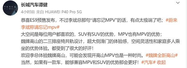 4月10日,长城汽车魏牌执行副总经理谭健通过社交平台公开发文,对蔚来ES9的顺利上市表示祝贺,并就李斌的“请忘记MPV”观点发表了自己的看法。谭健认为,李斌的这一表述略显极端,他强调大空间是每位用户都追求的,而SUV和MPV各自拥有独特的优势。