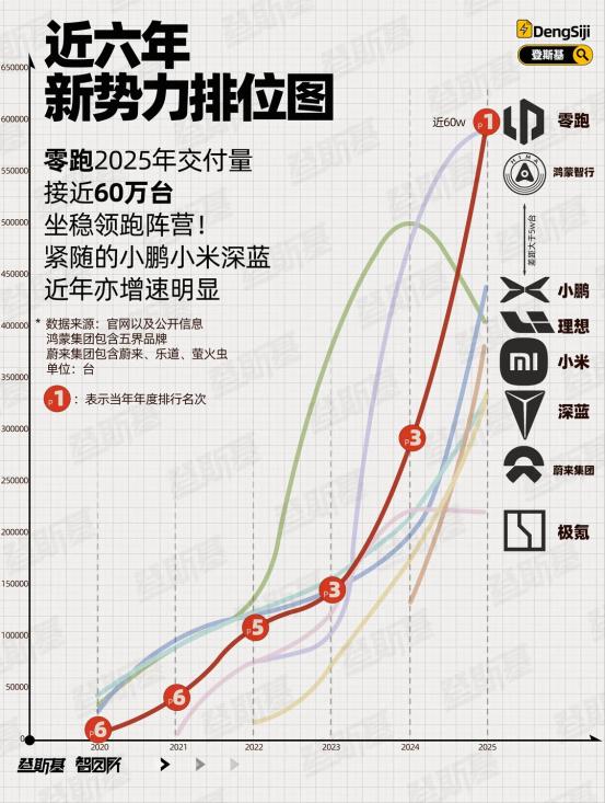 本文聚焦近六年(2020年-2025年)新势力排位(涵盖品牌:零跑、鸿蒙智行、小鹏、理想、小米、深蓝、蔚来、极氪),以四个关键时间节点,结合各品牌车型演进,聊聊新势力六年格局的变迁与行业发展。