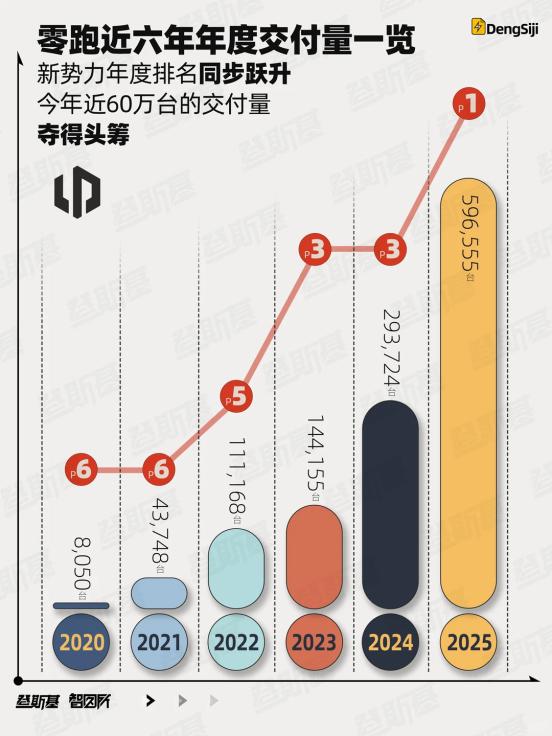 零跑以接近60万台(596555辆)的交付量跻身领跑阵营,其发展路径贴合大众用户需求,成为普惠型车企的代表。