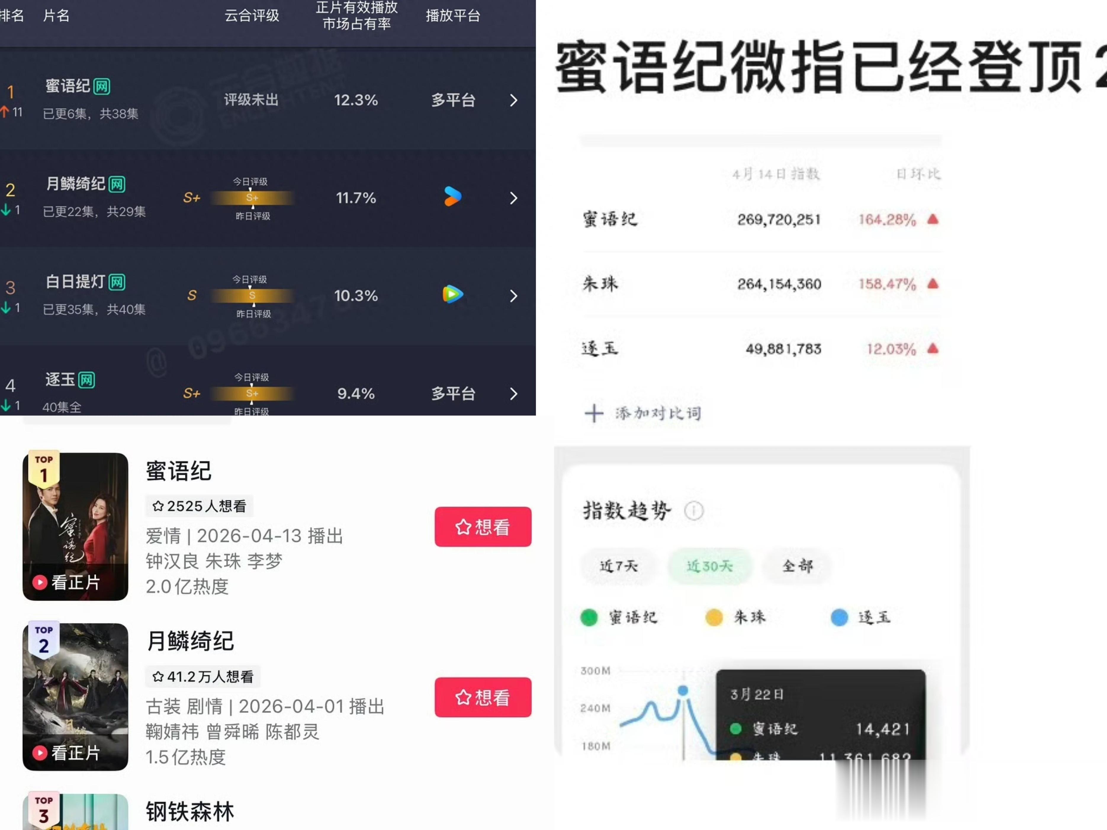 没想到,2026年的第一部黑马剧会是蜜语纪。这部剧开播首日就登顶卫视收视日冠,后续热度更是节节攀升,第三天腾讯热度就破26000,云合数据也超过一众流量主演的古偶剧登顶日冠。