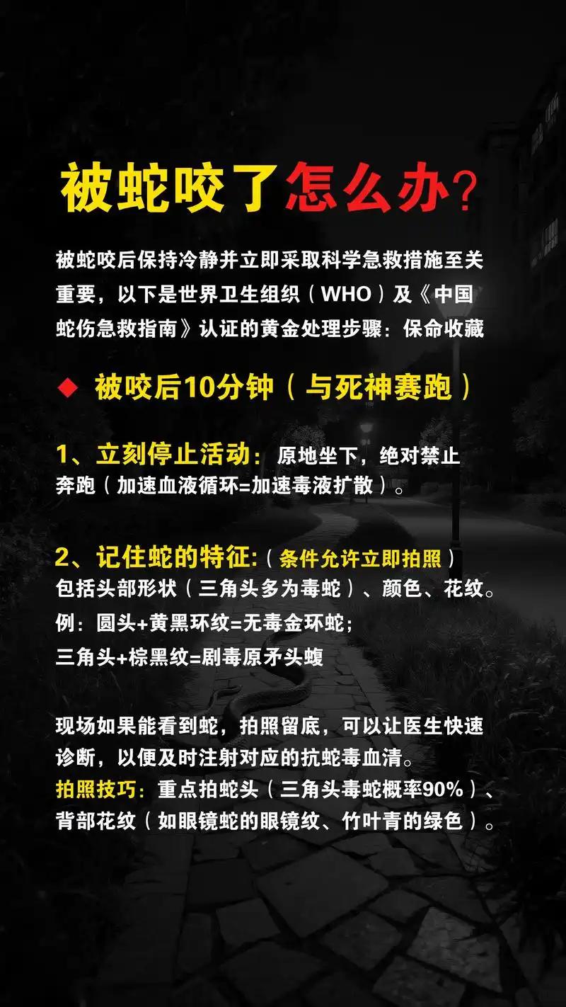 ✅ 立即送医:尽快到有蛇伤资质、有抗毒血清的医院,越早用血清,生还概率越大。