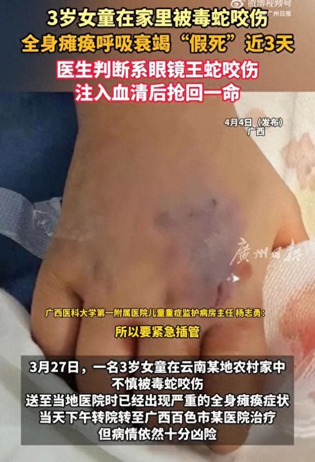 3月27日,云南文山一个普通的农村家庭里,3岁的小芸(化名)正在家中玩耍。平静突然被打破——一条隐匿的眼镜王蛇悄然出现,在孩子毫无防备时,狠狠咬向了她的小手。