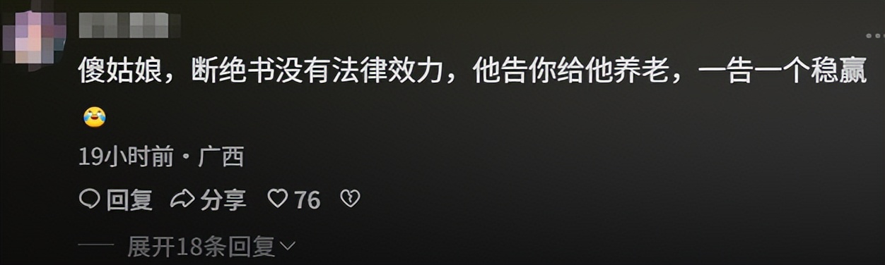 也有的网友说:这个断绝书不应该签,没有法律效力,以后还是要给他们养老的。