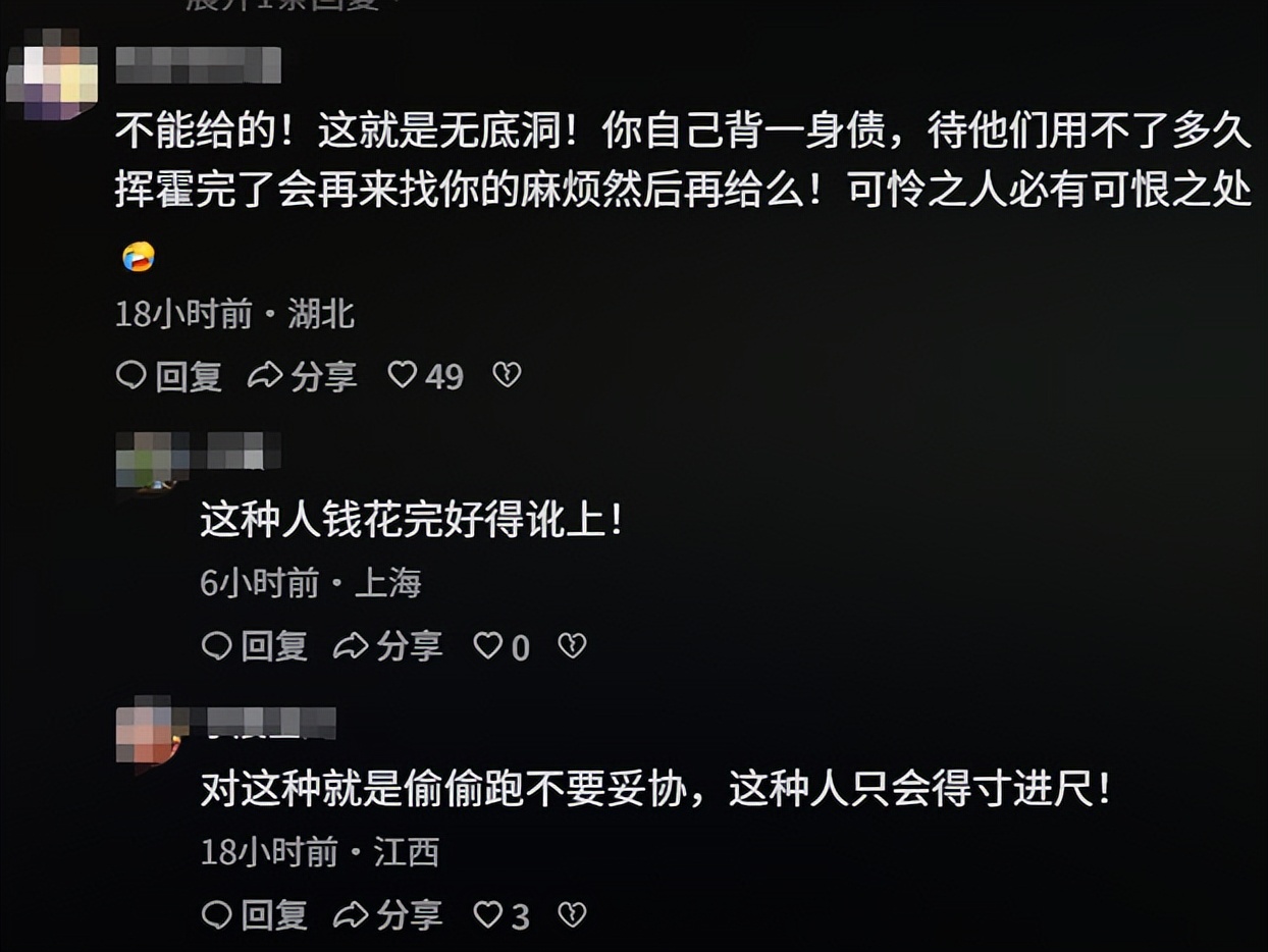 还有的网友认为女子不应该给这个钱,这就是无底洞,等他们花完钱还会讹上你的。