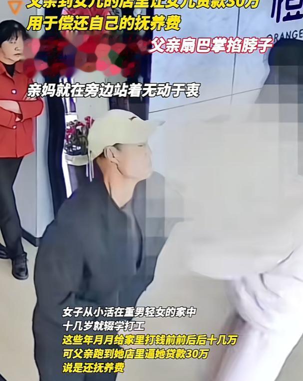 视频中,女儿穿着睡衣站在店中,被父亲扇耳光推搡,而母亲则站在一旁冷眼旁观,甚至帮忙指责女儿。