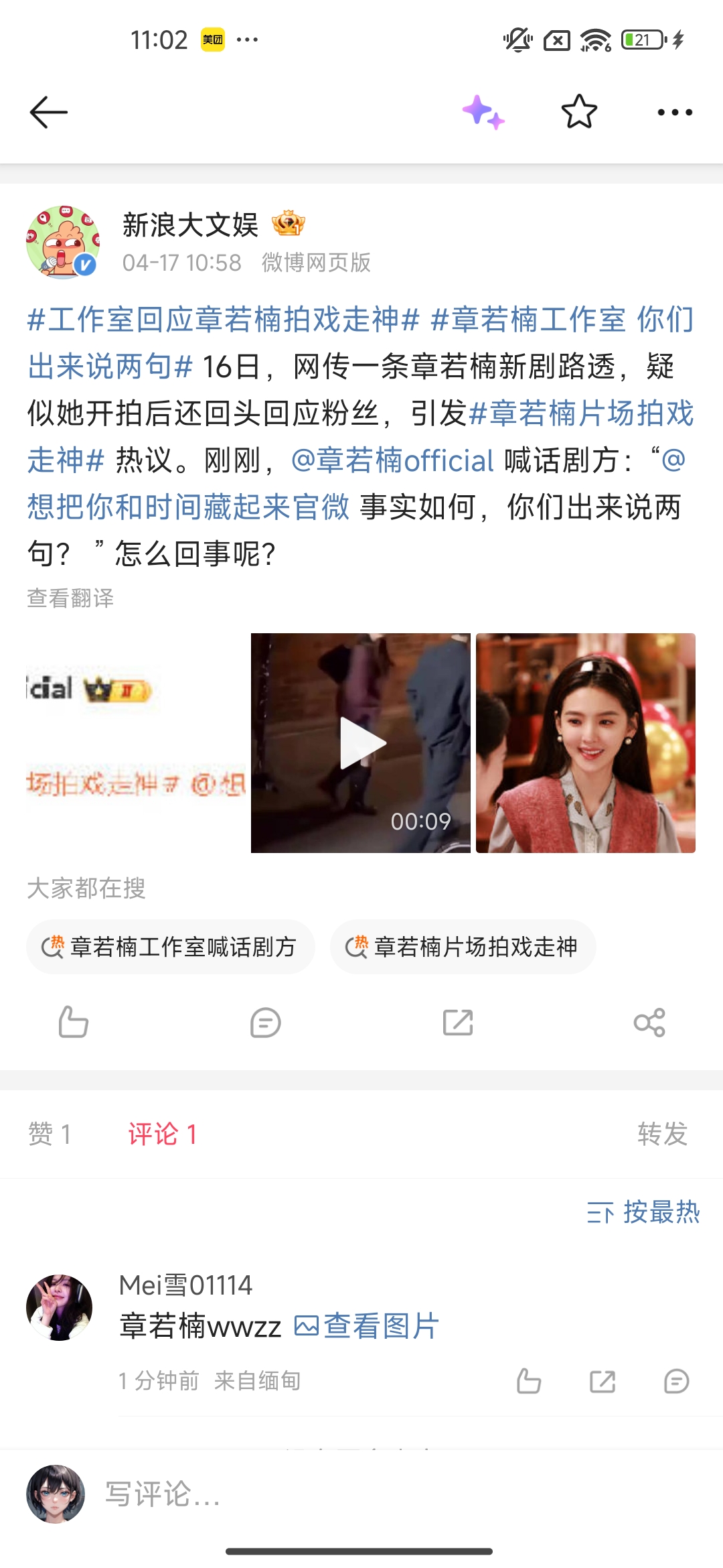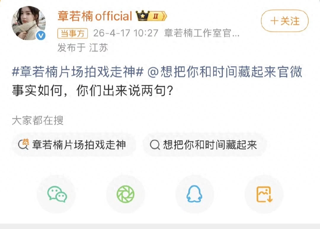 在4月17日上午,章若楠官方工作室直接下场,点名了章若楠拍戏的剧组官方账号,甩下了一句,事实如何,你们出来说两句。