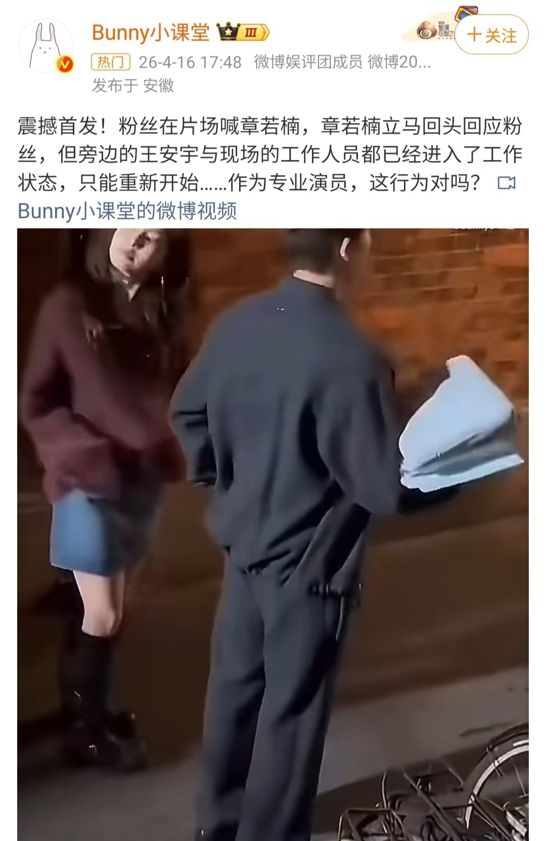4月17日,娱乐圈女演员章若楠片场拍戏走神风波迎来反转。
