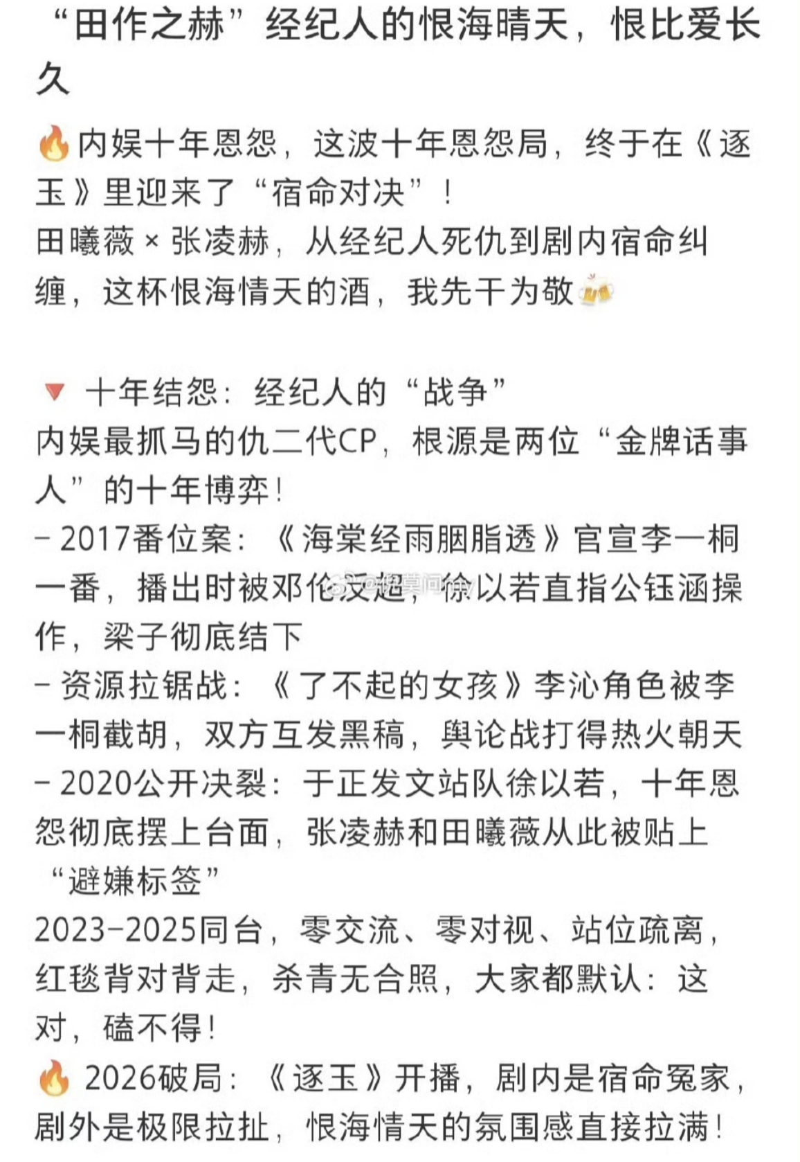 经纪人的"九年恩怨",演员买单,刘大锤这波爆料信息量巨大:田曦薇和张凌赫的经纪人不仅不和,而且"怨恨很深",这种矛盾已经持续了九年。啥概念?从《甄嬛传》播完到现在都还没九年呢!这俩经纪人估计连对方朋友圈点赞都要犹豫三秒的程度。