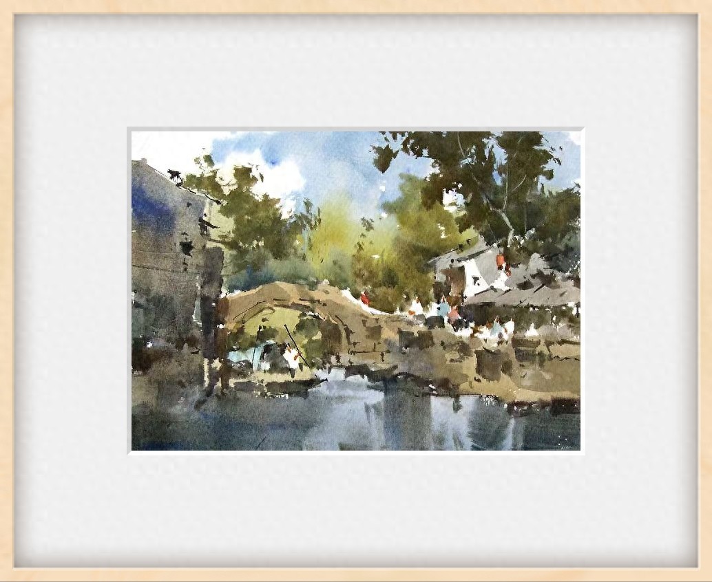 各位朋友,咱们这就跟着海派画家吴国炼老师的水彩笔,“踏”进这幅“把周庄的‘水韵、桥影、烟火气’全揉进画里”的景致中啦!你瞧这画,没去抠每块石板的纹路、每扇门窗的雕工,全靠水色“泼洒晕染”讲故事,反倒把“石桥卧在水上,人家枕着河湾,连风里都飘着江南水乡那股‘慢悠悠的鲜活气’”的感觉抓得死死的。