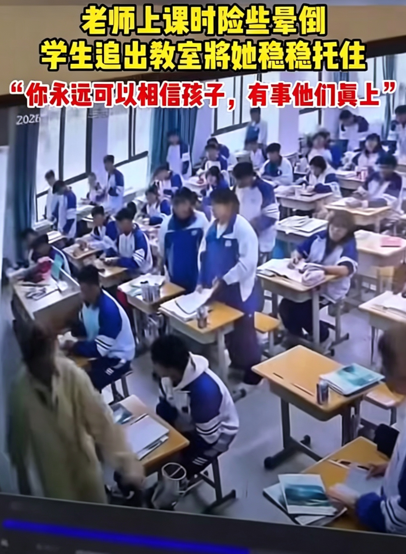 教室里,9名学生早已察觉异样。没有喧哗,没有迟疑,他们悄悄起身,轻手轻脚地跟在老师身后,目光紧紧锁住那个摇摇欲坠的背影。当老师身体一软、即将重重倒地的瞬间,9双稚嫩却有力的手齐刷刷伸出,稳稳托住了她的身体。