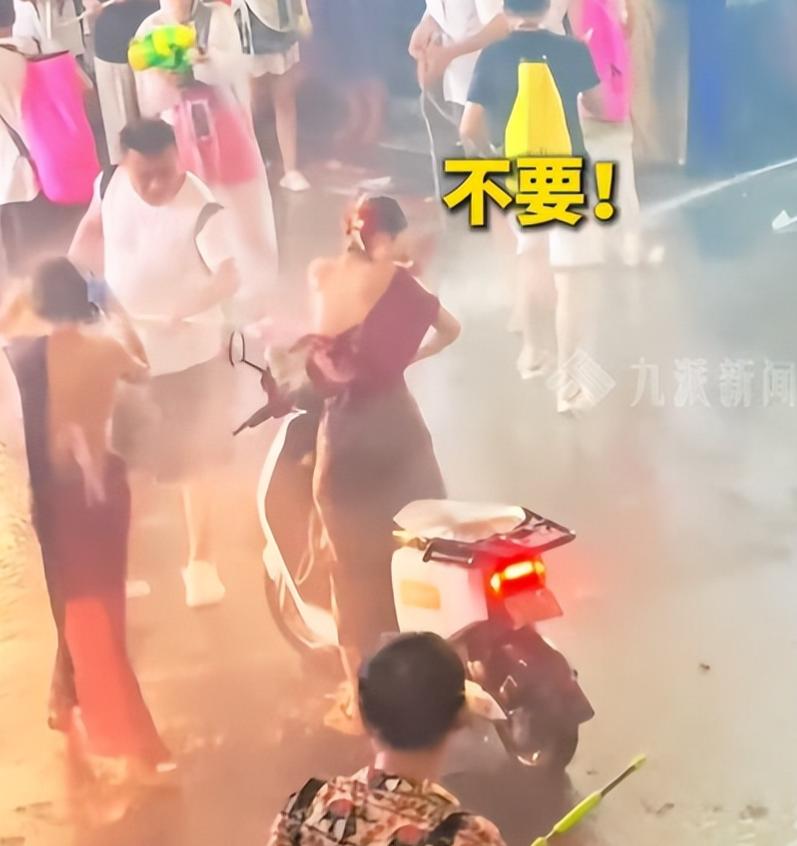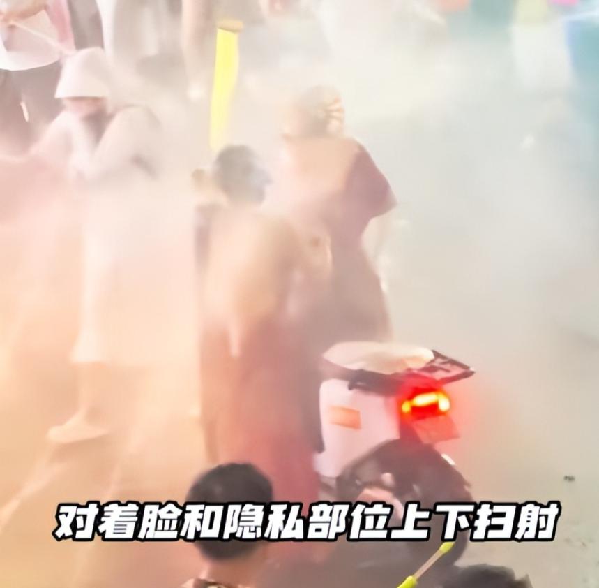 女孩们吓得连连摆手、大声拒绝,可那群人非但不停手,反而变本加厉,像打了鸡血一样追着喷。