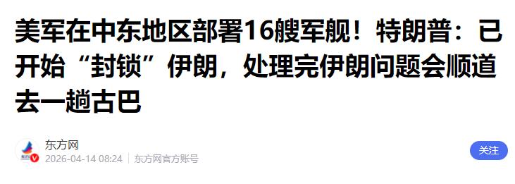 东方网:美军在中东地区部署16艘军舰!特朗普:已开始“封锁”伊朗,处理完伊朗问题会顺道去一趟古巴