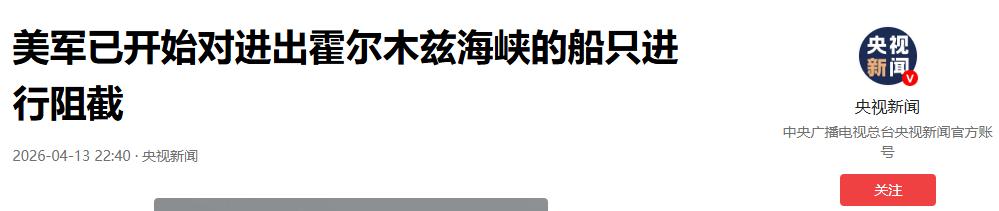 信息来源:央视新闻:美军已开始对进出霍尔木兹海峡的船只进行阻截