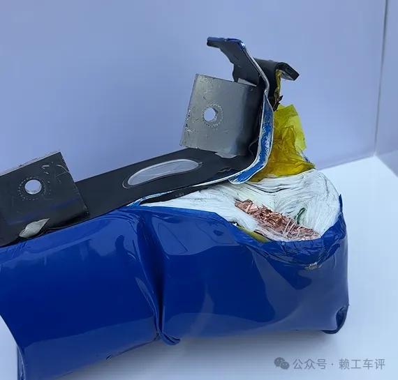 首先就是最关心的安全性,大家应该都知道电池最怕撞完之后挤压变形导致短路起火,你看下MG4这块半固态的,他们做了一个标准很高的测试,把单个电芯,对就是单个电芯,不是整包,进行挤压测试,施加250kN的力,达到了35%变形量,你仔细看内部结构都露出来了,
